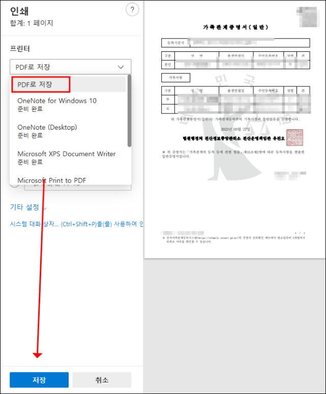 프린터 설정 옵션창이 열리면, 프린터 옵션 선택에서 'PDF로 저장'을 찾아 주고 저장버튼을 누르면 저장옵션창이 열립니다. 원하는 저장 위치를 지정한 후 저장 버튼을 누르면 가족관계증명서가 PDF 파일로 저장됩니다.