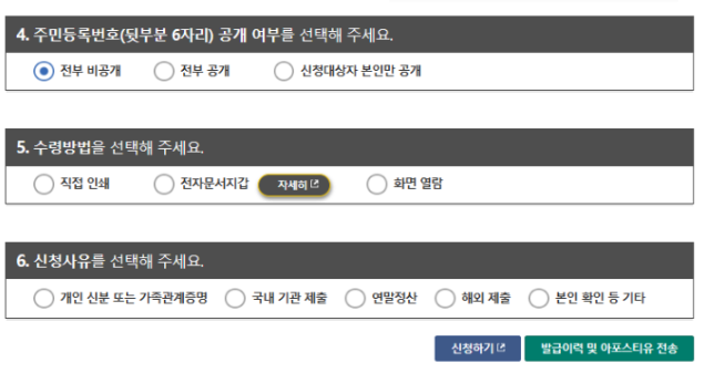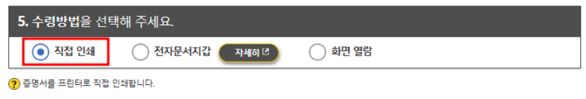 신청서 작성창의 5번 항목인 수령방법에서 '직접인쇄'를 선택하면 프린터 인쇄 또는 PDF파일 저장이 가능하니 꼭 선택하시길 바랍니다.