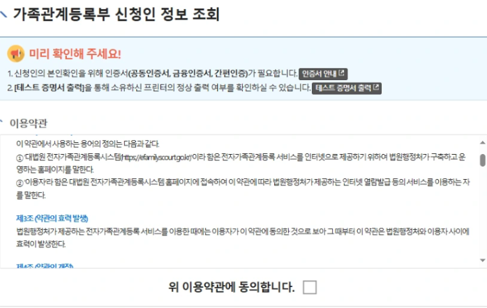 신청하기를 누르면, 요청한 내용대로 가족관계증명서를 발급받을 수 있습니다. 이때, 주의할 점은 가족관계증명서 발급 전, 반드시 출력가능한 프린터인지 확인을 미리 해보시고 진행하시길 바랍니다.