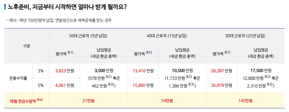 예를 들어, 총급여가 5,500만 원 이하인 납세자가 개인연금저축과 IRP에 총 900만 원을 납입했을 경우, 16.5%의 세액공제율이 적용되어 약 148만 5천 원의 세금을 공제받을 수 있습니다.