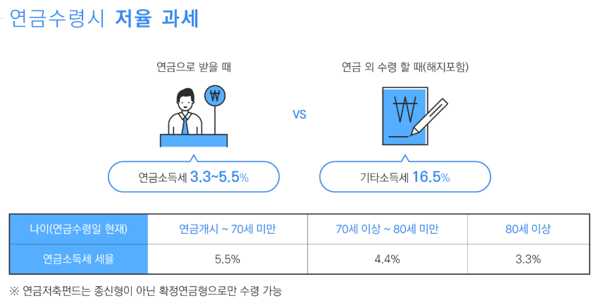 - 연금수령액이 연간 1,500만 원 이하: 분리과세로 3.3%~5.5%의 세율 적용