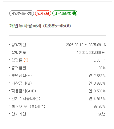 만기별 분산 투자: 5년물, 10년물, 20년물을 적절히 조합하여 투자하면 리스크를 분산하면서도 안정적인 수익을 확보할 수 있습니다. 특히 20년물의 경우 약 99%의 높은 만기 수익률을 제공하므로 장기 투자 목적에 적합합니다.