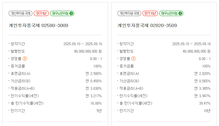 개인투자용 국채 금리는 8월에 발행한 동일 연물 국고채의 낙찰금리를 기준으로 하여, 여기에 가산금리를 추가하는 방식으로 결정됩니다. 5년물의 경우 표면금리 2.580%에 가산금리 0.450%를 더해 총 3.030%의 개인투자용 국채 금리가 적용됩니다.