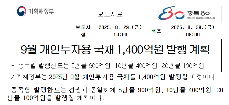 기획재정부가 2025년 9월 개인투자용 국채를 1,400억원 규모로 발행한다고 발표했습니다. 개인투자용 국채 금리가 지속적으로 높은 수준을 유지하고 있어 많은 투자자들의 관심이 집중되고 있는데요. 특히 기준금리 인하 전까지는 현재 개인투자용 국채 금리 수준이 계속 유지될 것으로 예상됩니다.