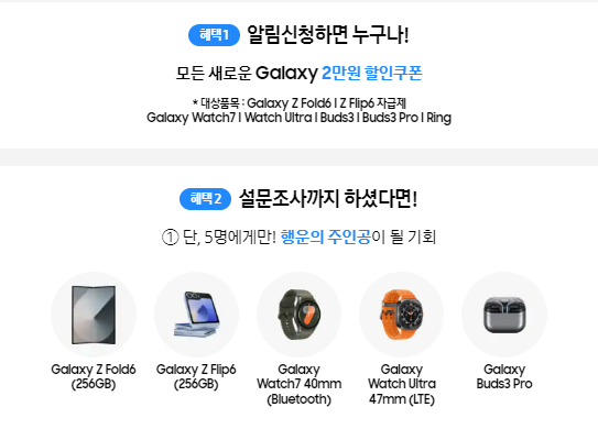 삼성 케어플러스 파손보장형 1년권, 갤럭시 워치7·워치 울트라·버즈3 시리즈 30% 할인 쿠폰, 모바일 액세서리 30% 할인 쿠폰 3장, 유튜브 프리미엄 3개월 체험권 등.