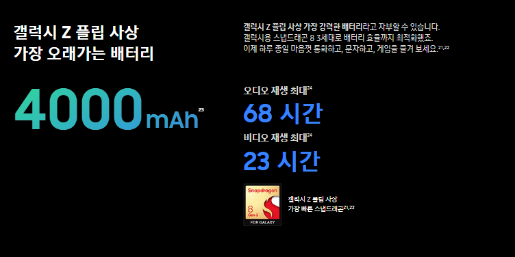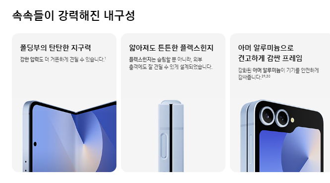 • 배터리 용량: 갤럭시 Z플립6는 4000mAh로 갤럭시 Z플립5의 3700mAh보다 더 오래갑니다.