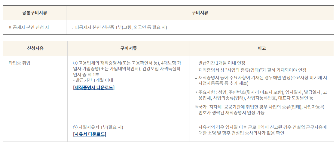 • 퇴직공제금 지급신청서: 건설근로자공제회 홈페이지에서 다운로드 가능