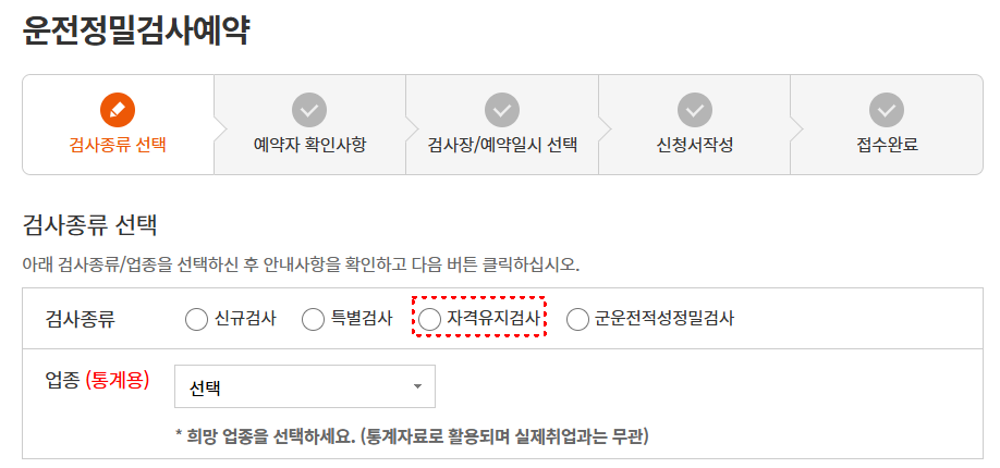 - "운전정밀검사예약" 메뉴를 선택하면 자격유지 유형과 업종 선택 화면이 나타납니다.