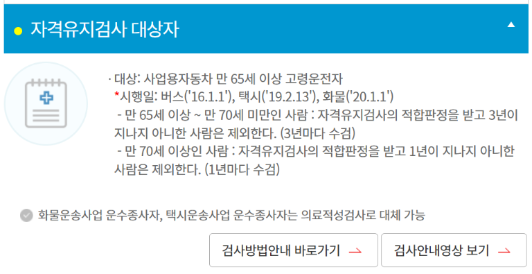 화물이나 택시 운송업 등 사업용 차량을 운행하는 만 65세 이상 고령운전자는 별도의 규정이 적용될 수 있으므로, 관련 정보를 미리 확인하시는 것이 좋습니다.