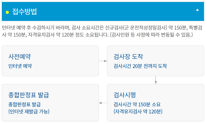 고령운전자 자격유지검사 당일에는 다음과 같은 절차로 진행됩니다: