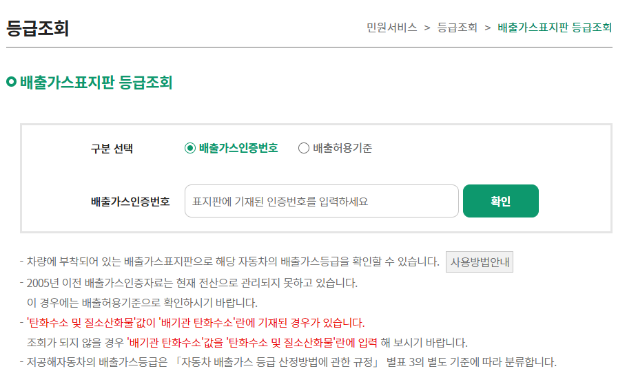 먼저 환경부 자동차 배출가스 등급 조회 시스템을 통해 본인 차량의 등급을 확인하시기 바랍니다.