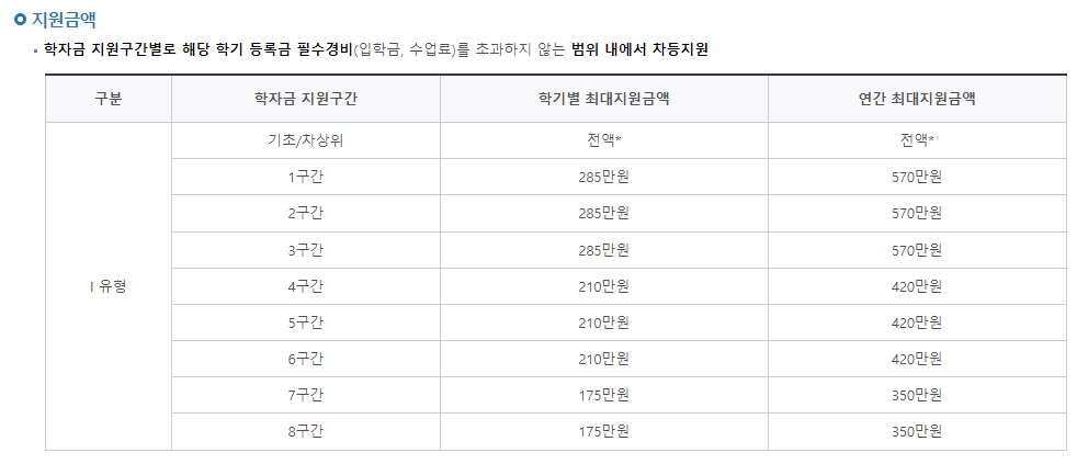 예를 들어, 기초생활수급자와 차상위계층 학생들은 등록금 전액을 지원받을 수 있으며, 1~3구간에 해당하는 학생들은 연간 최대 570만 원까지 지원받을 수 있습니다. 4~6구간의 경우 연간 최대 420만 원, 7~8구간의 학생들은 최대 350만 원까지 지원받을 수 있습니다.