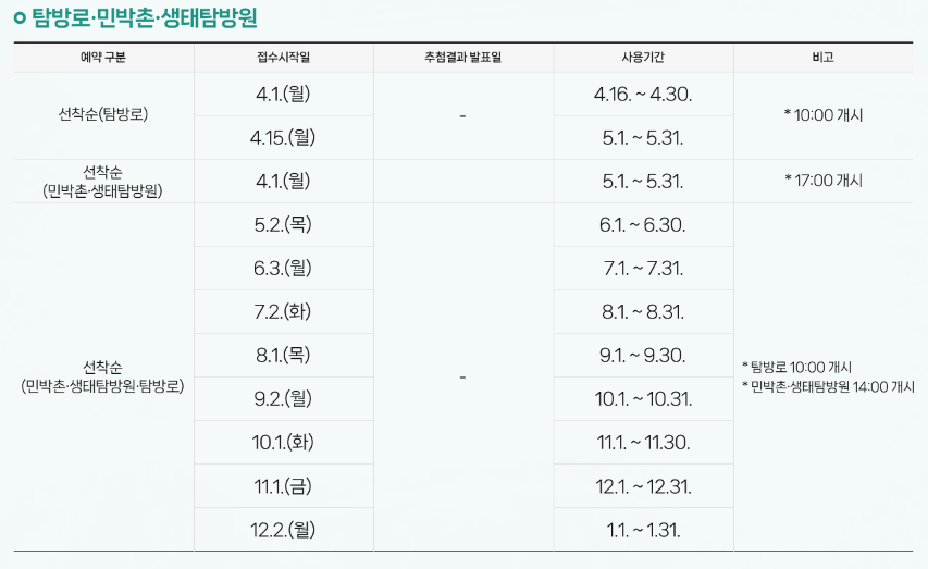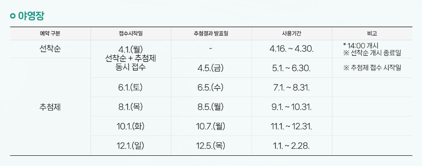 추첨제의 경우, 특정 기간 동안 신청을 받고, 이후 무작위로 예약이 확정됩니다. 또한, 시즌에 따라 예약이 가능한 시설이 달라지므로, 방문하고자 하는 시기에 맞춰 적절한 시설을 선택해야 합니다.