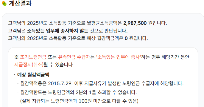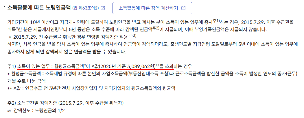 2025년 기준 이 금액은 3,089,062원입니다. 한 달 평균 소득이 약 309만원을 넘는 경우부터 감액 대상이 될 수 있다는 것입니다.
