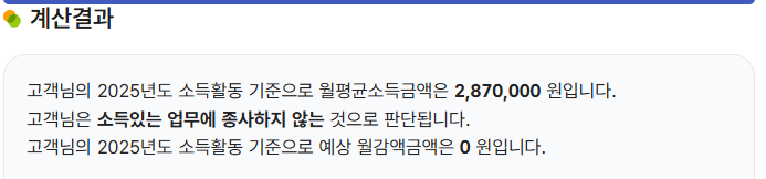 이 금액은 A값보다 낮기 때문에 연금은 전액 받을 수 있습니다. 이처럼 소득 공제를 반영해서 계산한 월 평균 소득이 기준이 됩니다.