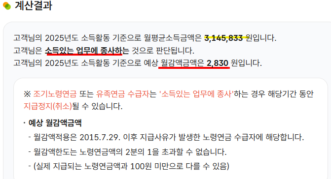 이 금액은 A값보다 낮기 때문에 연금은 전액 받을 수 있습니다. 이처럼 소득 공제를 반영해서 계산한 월 평균 소득이 기준이 됩니다.