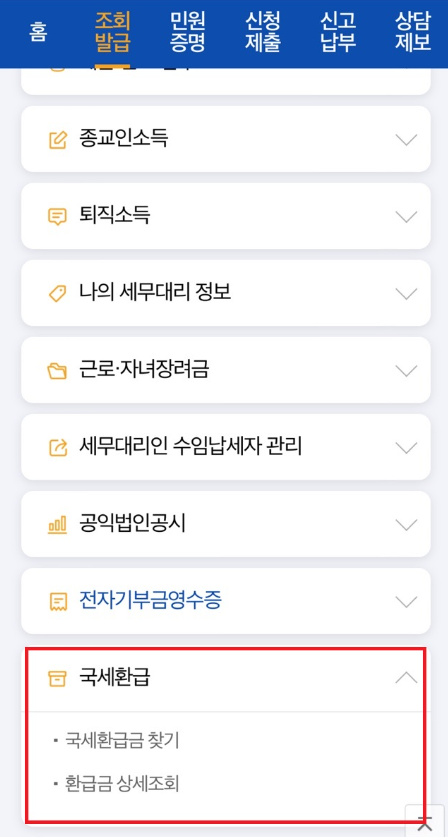 3. 하위 메뉴에서 [국세환급금 찾기] 선택
