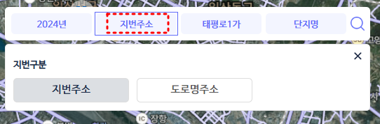 차례대로, 연도를 먼저 선택하고, 지번주소 또는 도로명주소를 선택한 뒤 검색하고자하는 주소를 [시/군/구]로 선택하여 조회해주세요, 이후 아파트 단지명을 최종적으로 입력하면 단지 목록을 확인할 수 있습니다.