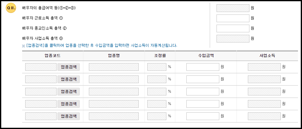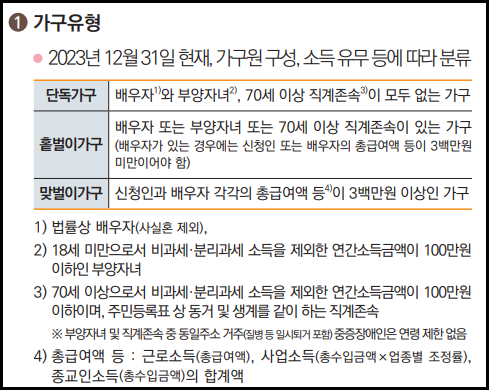 - 맞벌이가구: 신청인과 배우자 각각의 총급여액이 300만 원 이상인 가구.