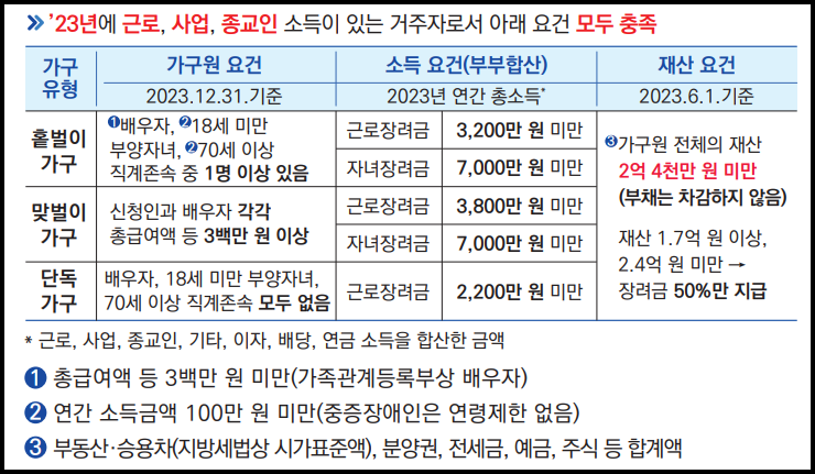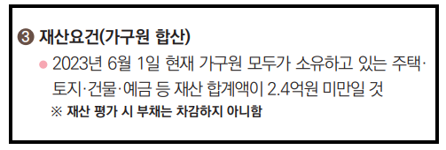 2023년 6월 1일 기준으로 소유한 재산 합계액이 2억 4천만 원 미만이어야 합니다. 재산에는 주택, 토지, 건축물, 승용차, 전세금, 금융자산, 유가증권 등이 포함됩니다.