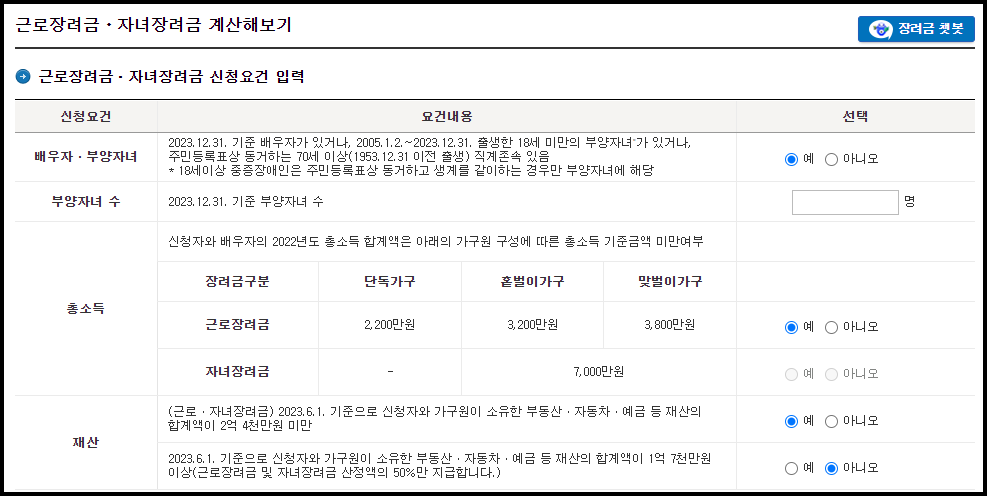 근로장려금 예상 수령액 계산기에서는 신청자격 요건과, 본인의 총급여액, 배우자의 급여액, 신청제외자 해당여부를 체크하는 것으로 예상금액을 계산할 수 있습니다.