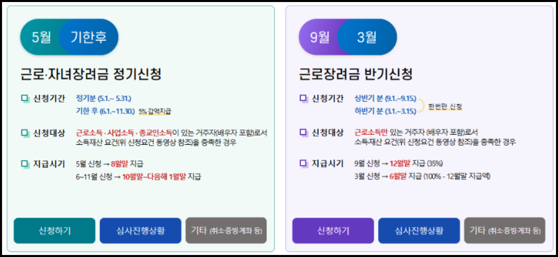 정기신청의 근로장려금, 자녀장려금 지급일은 신청 마감일 이후 약 3개월 후인 9월 말에 지급됩니다. 예를 들어, 2024년 정기신청은 5월에 이루어지며, 근로장려금 지급일은 9월 말까지 이뤄집니다.