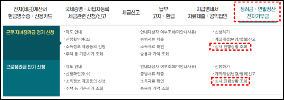 홈택스에 접속하여 '장려금/연말정산/전자기부금' 메뉴에서 '정기 OR 반기 심사 진행상황 조회'를 선택하면 됩니다.