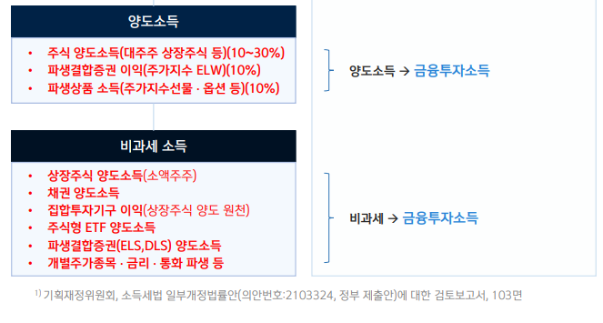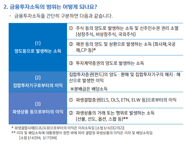 구체적으로는 국내 상장주식, 채권, 공모 펀드, ETF(상장지수펀드) 등에서 발생하는 소득이 해당되며, 비상장 주식 및 해외 주식 투자 소득도 금투세란 과세 범위에 포함됩니다.