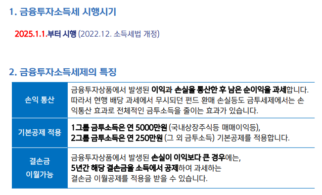 금투세 시행시기가 되면, 연간 금융투자소득이 5천만 원을 초과하는 경우 과세가 시작됩니다.
