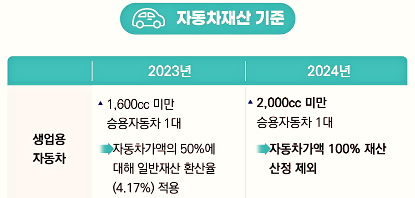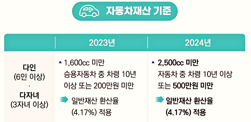 2024년 기준 중위소득 완화뿐만 아니라, 자동차 기준도 큰 변화가 생겼습니다.