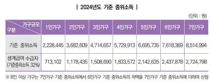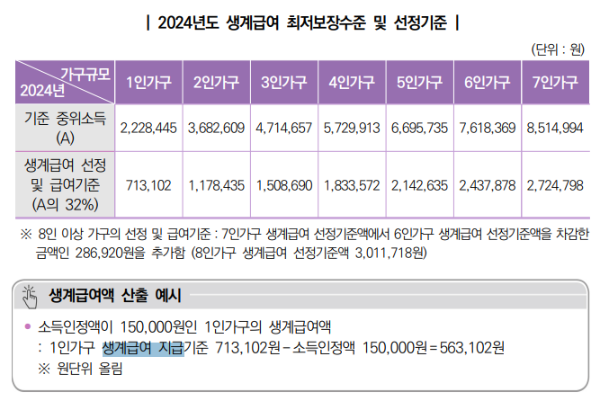 특히 2024년도부터는 생계급여 자격요건인 기준 중위소득 기준이 완화되어 32% 이하자까지는 생계급여 신청자격이 주어집니다.