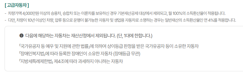 다만 장애인 차량이나 생업용 차량, 10년 이상 된 차량의 경우에는 재산 산정에서 제외됩니다. 생업용 차량은 화물 운반이나 여객운송에 사용되는 차량을 의미하며, 장애인 차량은 본인이나 함께 거주하는 직계가족 명의의 차량이 해당됩니다.