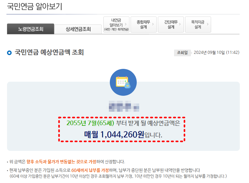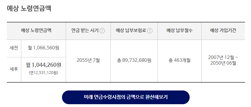 노령연금 조회를 선택하고 ' 예상연금 계산하기'를 누르면, 다음과 같이 노령연금 예상 수령월과 예상연금액이 표시됩니다.