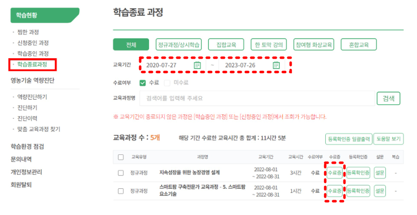 농업 교육포털 수료증 발급방법