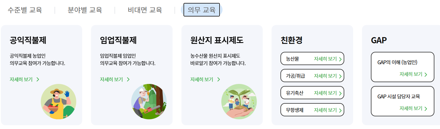 의무교육 과정에는 공익직불제, 임업직불제, 원산지 표시 제도, 친환경 농업 관련 교육 등이 포함되어 있으며, 이는 농업인들이 필요한 지식을 종합적으로 습득할 수 있는 기회를 제공합니다.
