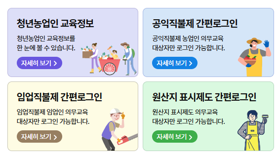 농업 교육포털 홈페이지는 예비농업인부터 전문농업인에게 필요한 교육을 다양하게 제공하고 있습니다. 또한, 특정대상자의 간편 로그인 서비스를 통해서 꼭 이수해야 하는 의무교육을 번거롭지 않게 사용하기 쉽고 직관적인 인터페이스를 자랑합니다.
