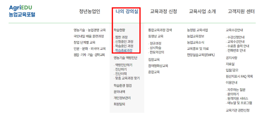우선, 농업 교육포털에 로그인한 후, [나의 강의실] 섹션으로 이동합니다. 여기서 '학습종료과정' 목록을 선택합니다.