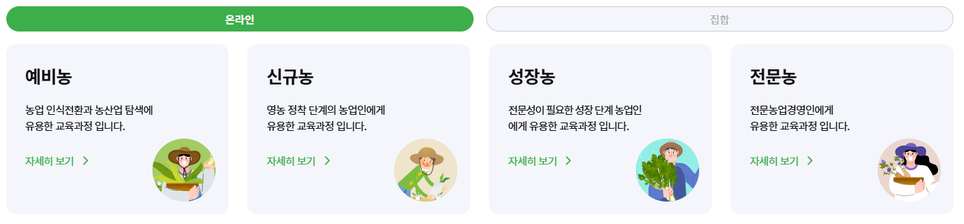 교육과정 검색을 통해서 집학교육, 참여형 화상교육, 혼합교육, 동영상교육 등 원하는 농업교육을 검색할 수 있습니다.