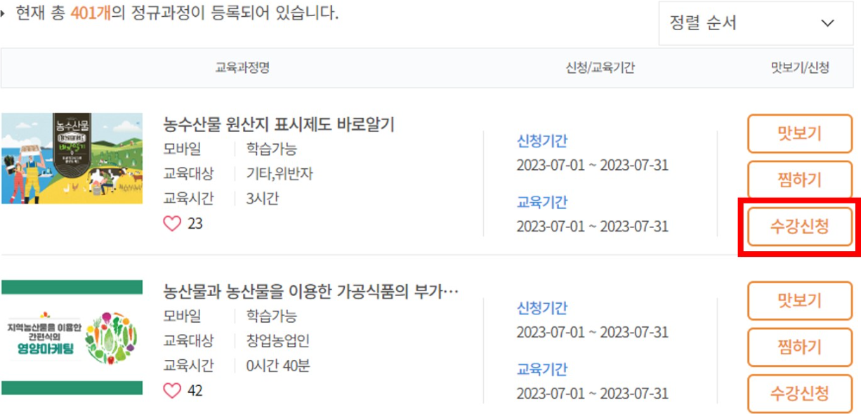 검색결과에 원하는 교육과정이 검색되면, 우측의 수강신청 버튼을 클릭하여 수강신청을 할 수 있습니다.