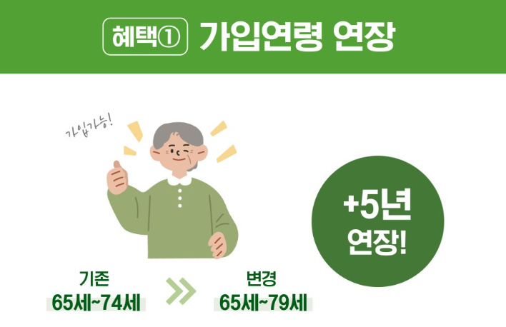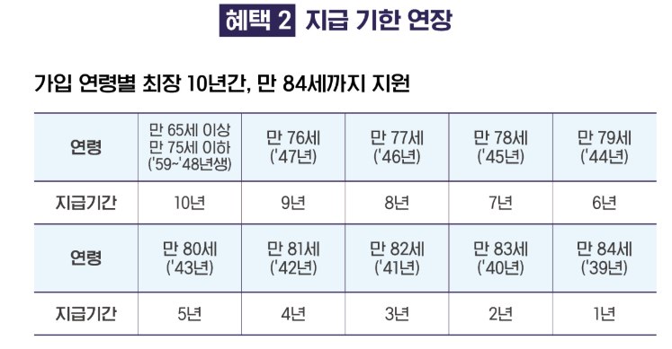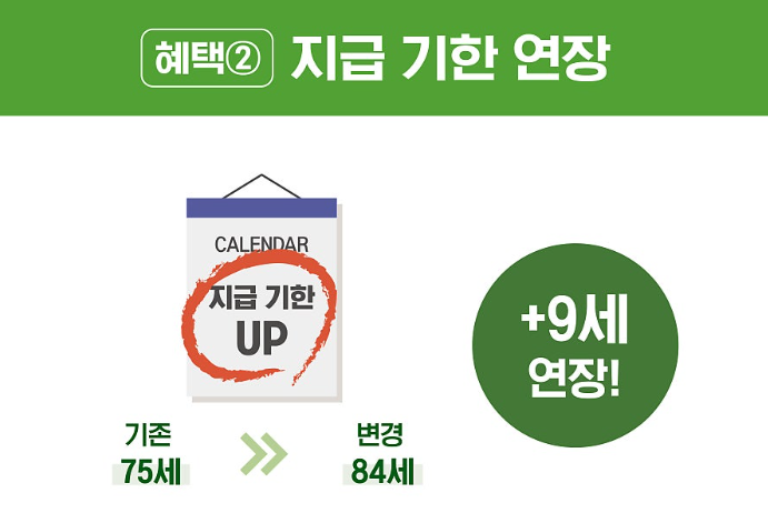 - 연령확대 : 기존에는 65세부터 74세까지 신청가능했으나, 개편된 제도는 65세부터 79세까지 신청가능하며, 지급기간은 최대 84세까지 연장.