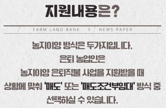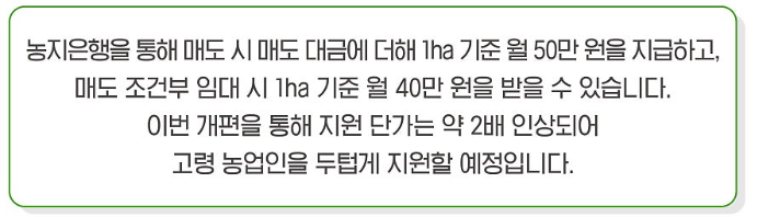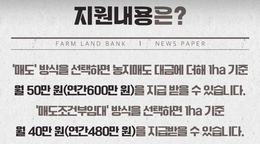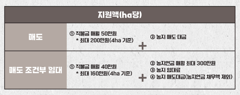 반면, 매도 조건부 임대방식을 선택하는 경우 1헥타르당 40만원이 지급되며, 최대 월 160만원까지 지원 받을 수 있습니다.
