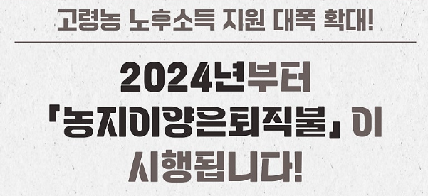 한국농어촌공사에서 더이상 농사를 짓지못하는 고령 농업인들의 안정적인 노후생활을 보장받을 수 있도록 농지이양 은퇴직불사업을 진행하고있습니다. 해당제도는 고령 농업인이 소유한 농지를 청년 농업인 등에게 이양하면서 농업 경영에서 은퇴하는 경우 은퇴자금으로 10년간 매월  일정금액을 지급받을 수 있습니다.