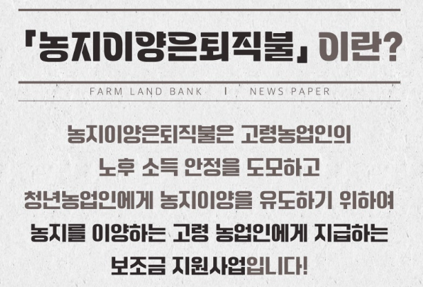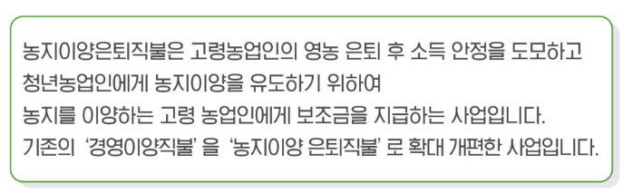 농지이양 은퇴직불제는 고령 농업인이 소유하고 있는 농지를 청년 농업인들에게 이양함으로서 은퇴할 경우, 정부가 최대 10년동안 직불금을 지원하는 제도입니다.