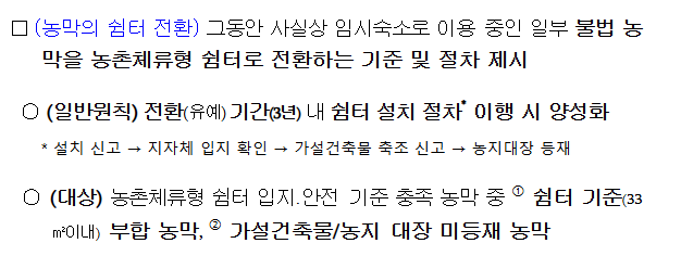 또한, 기존 농막을 쉼터 설치 기준에 맞출 경우, 일정 기간 내 신고를 통해 농촌체류형 쉼터로 전환할 수 있습니다.