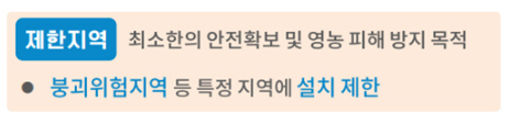 붕괴위험지역, 자연재해 위험 개선지구, 방재지구 등 특정 지역에는 설치가 제한됩니다. 이는 최소한의 안전확보와 영농 피해 방지를 위한 조치입니다.