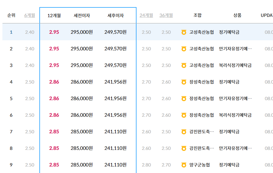 2025년 8월 기준, 농협 계열(축협 포함)에서 제공하는 정기예금 상품 중 가장 높은 금리를 자랑하는 TOP 3를 살펴보면, 고성축산농협이 상위권을 모두 차지하고 있는 것이 눈에 띕니다.