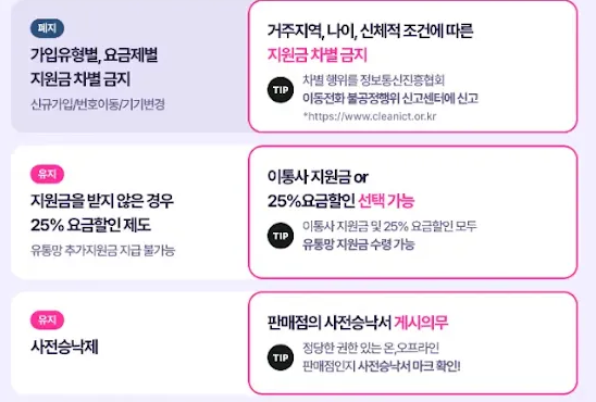 이제는 나이나 사는 곳, 건강 상태 같은 걸로 단통법 폐지 휴대폰 가격이나 지원금에서 차별받는 일이 절대 없도록 엄격하게 금지돼요. 만약에 "나이가 많아서 지원금 적게 줄게요" 이런 식으로 말하면 바로 신고하시면 돼요!