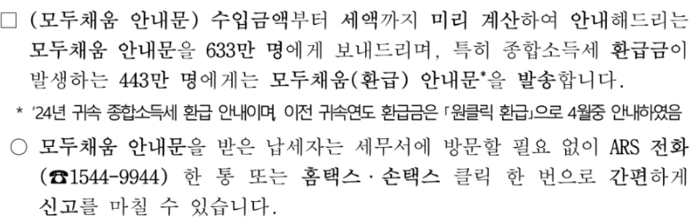 이러한 조건에 해당하는 납세자들은 2025년 4월 중에 국세청으로부터 문자 또는 우편으로 모두채움 신고 안내를 받게 됩니다. 만약 안내를 받지 못했다면, 홈택스에서 직접 확인해볼 수 있습니다.