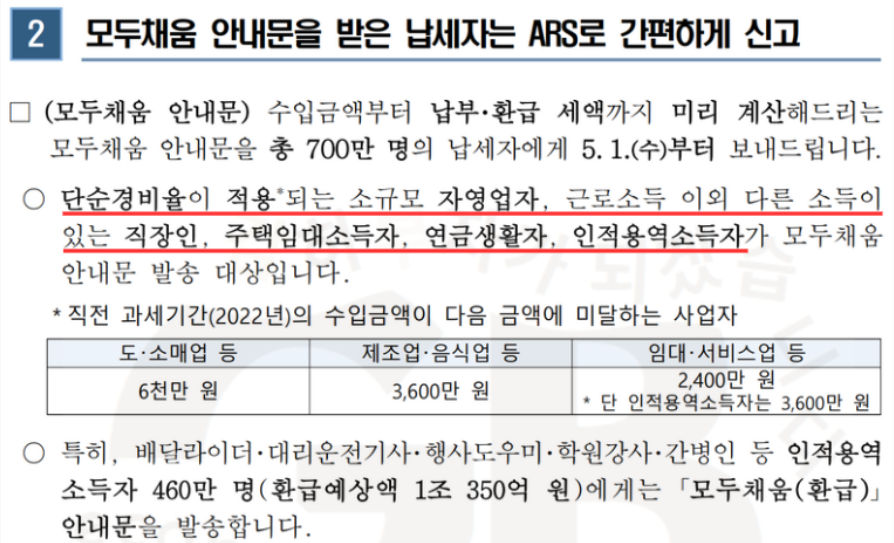 - 모두채움신고: 단순경비율 대상 소득, 인적용역 등 비교적 단순한 소득 구조