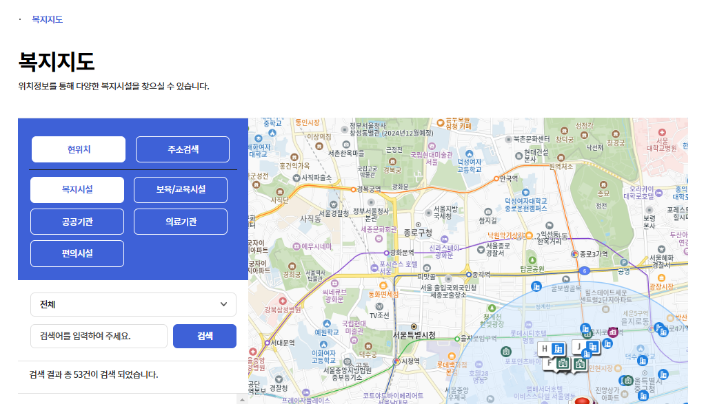 복지 시설 조회 기능을 활용하면, 거주지 주변의 복지 관련 시설을 찾을 수 있습니다.